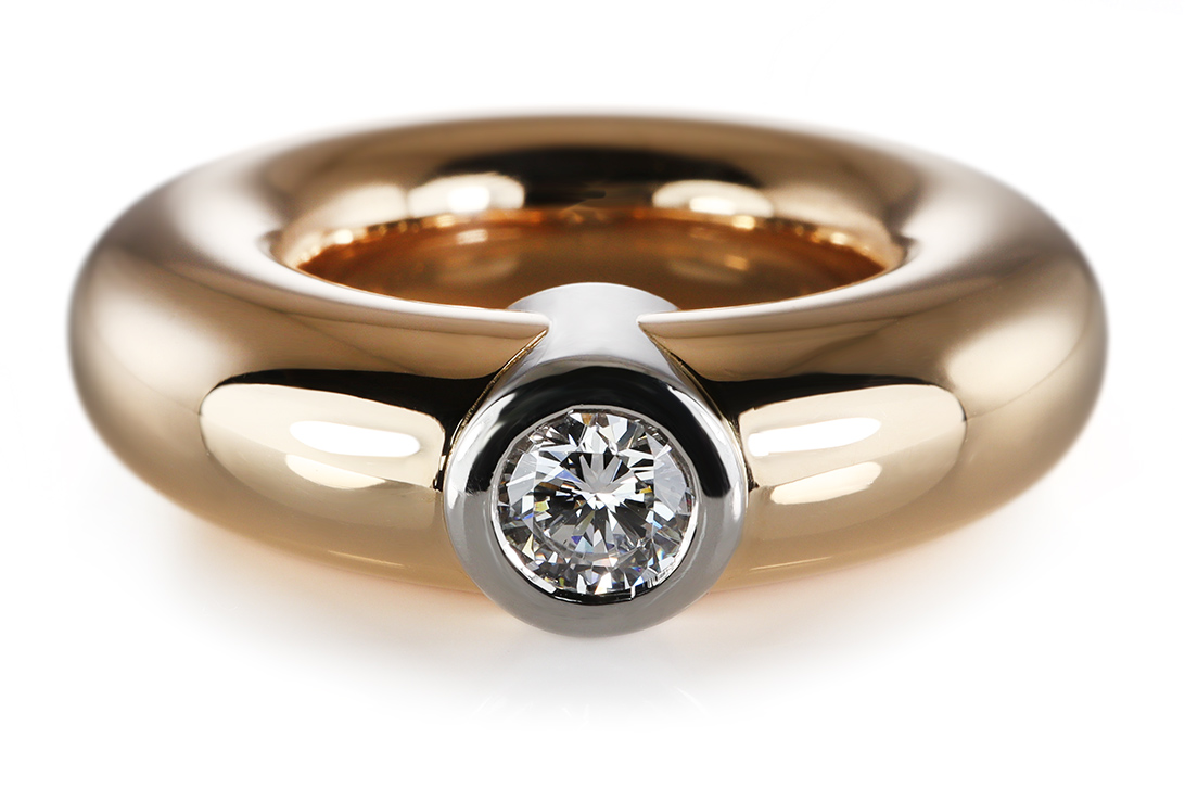 Dieser Ring präsentiert sich in einer kraftvollen und zugleich eleganten Gestaltung, die durch die Kombination von 750er Gelbgold und Weißgold eine besonders edle Ausstrahlung erhält. Die harmonische Verbindung der beiden Edelmetalle verleiht dem Schmuckstück Tiefe und unterstreicht seine charaktervolle Erscheinung. Mit einem Gesamtgewicht von etwa 23,8 Gramm besitzt der Ring eine spürbare Präsenz und vermittelt die hochwertige Ausführung dieses außergewöhnlichen Designs.