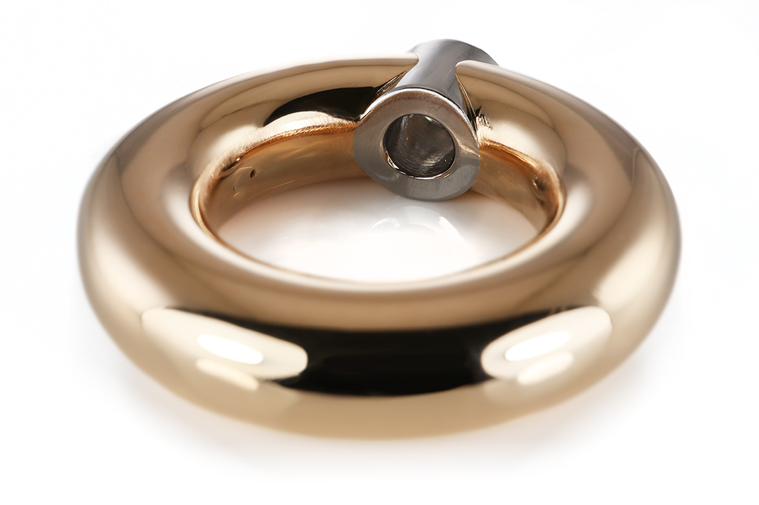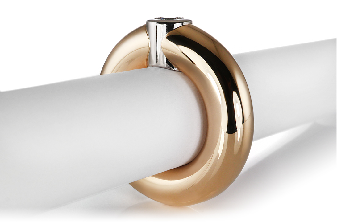 Der Ring überzeugt durch seine markante Formgebung. Die Ringschiene weist im vorderen Bereich eine Breite von etwa 7,5 mm und eine Stärke von rund 8,4 mm auf und sorgt damit für eine ausdrucksstarke Erscheinung am Finger. Auch im hinteren Bereich bleibt die Gestaltung mit etwa 7,4 mm Breite und 7,2 mm Stärke angenehm massiv und komfortabel. Die Linienführung wirkt kraftvoll und modern, während der zentral gesetzte Diamant einen eleganten Akzent setzt.