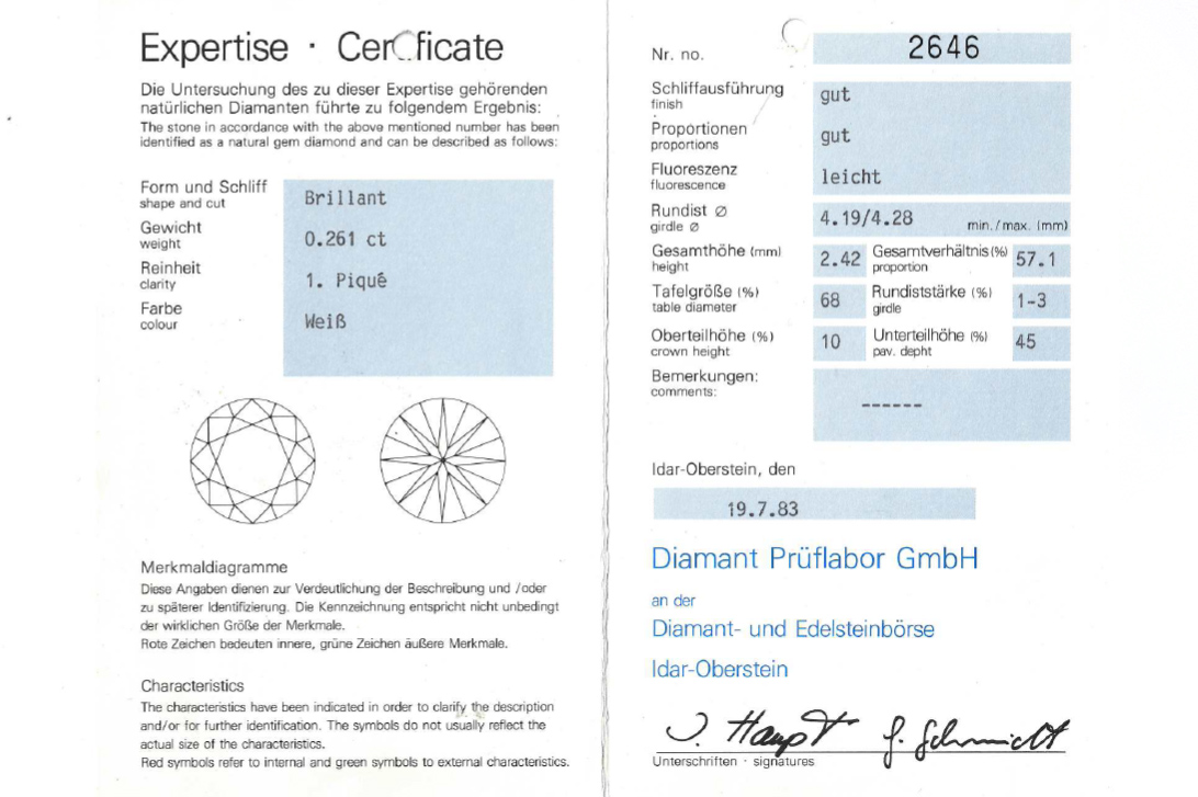Begleitet wird dieses Schmuckstück von einem DPL-Gutachten zum Diamanten sowie einem hauseigenen Schmuckgutachten, welche die Eigenschaften des Rings dokumentieren.