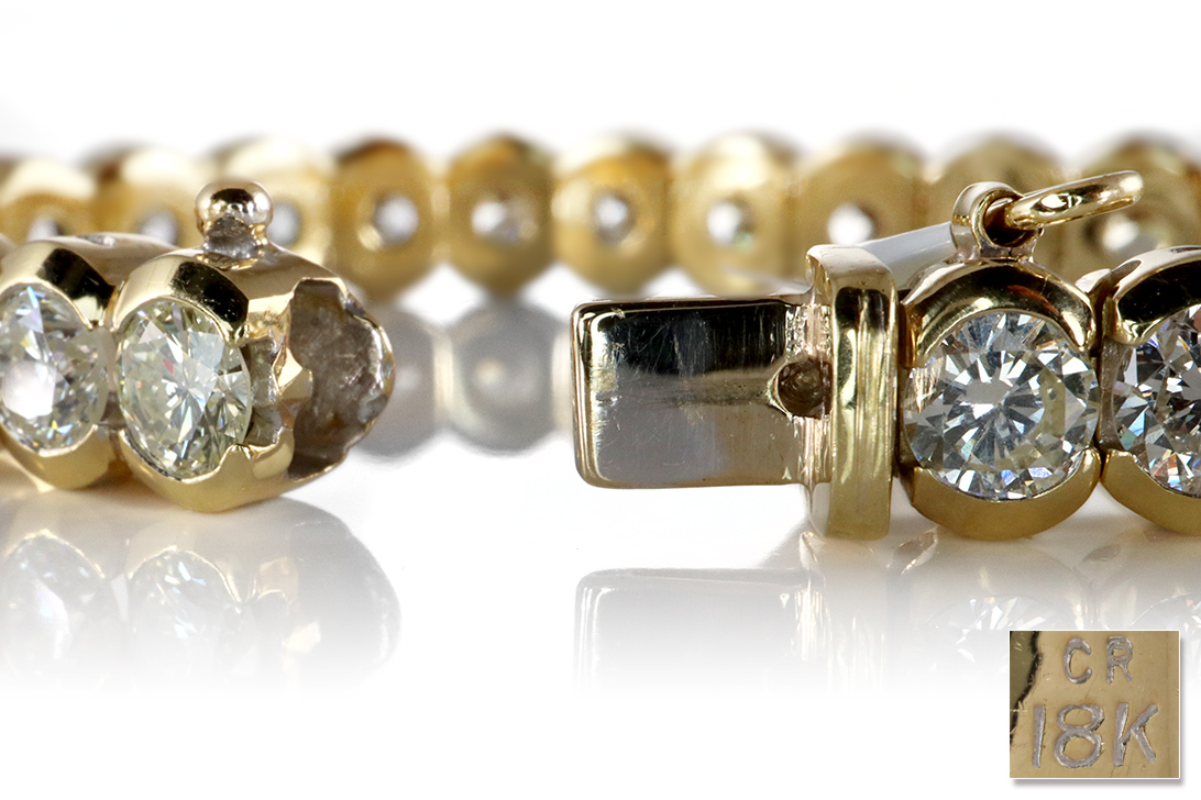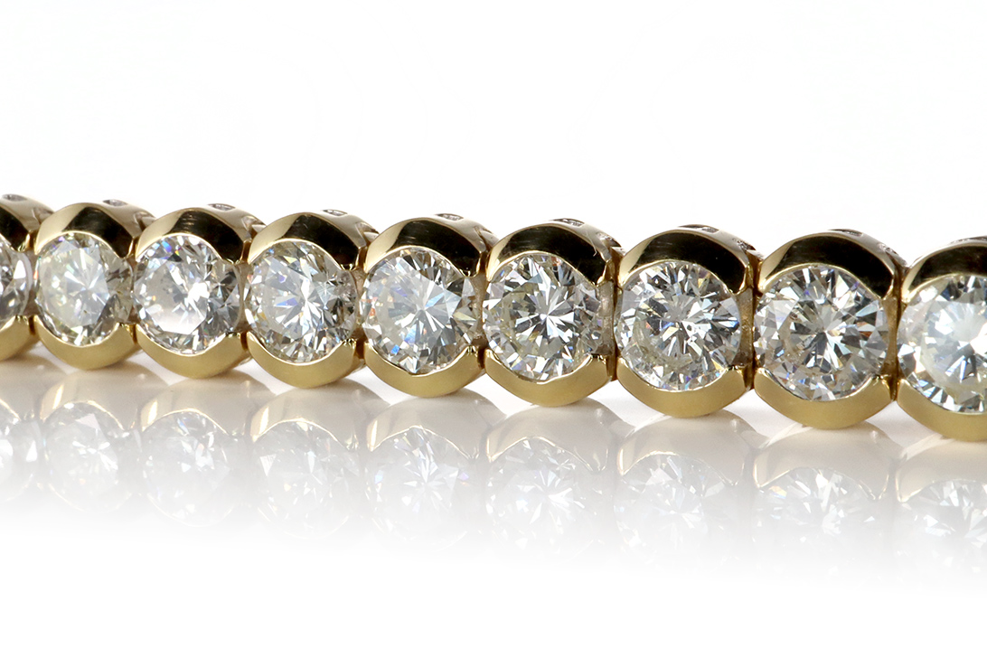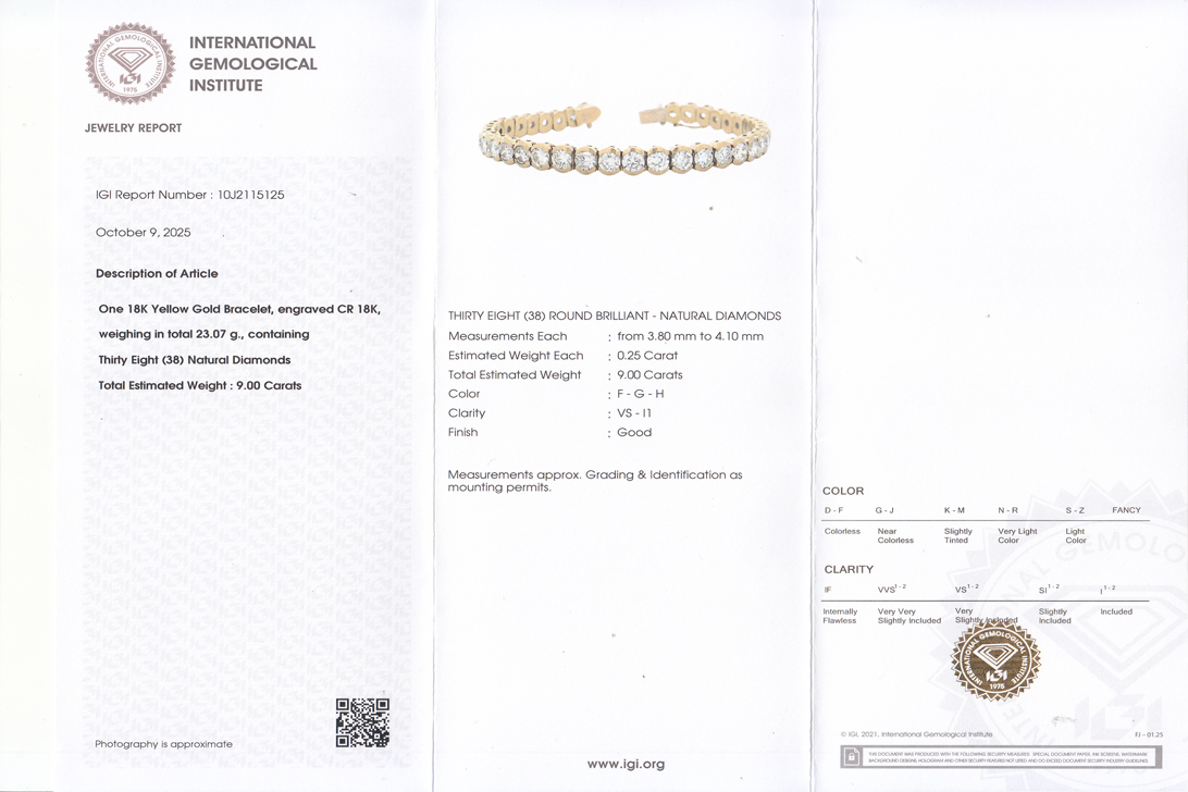 Dieses eindrucksvolle Tennisarmband besteht aus hochwertigem 750/- Gelbgold und beeindruckt durch seine außergewöhnliche Brillanz. Insgesamt 38 funkelnde Diamanten mit einem Gesamtgewicht von etwa 9,0 Karat verleihen diesem Schmuckstück seine luxuriöse Ausstrahlung. Die Steine zeigen eine harmonische Farbskala von F bis H und weisen Reinheiten von VS bis P1 auf, wodurch sie ein lebendiges, facettenreiches Funkeln entfalten. Jeder einzelne Diamant ist im klassischen Brillantschliff gearbeitet und perfekt gefasst, sodass das Licht in allen Winkeln eindrucksvoll reflektiert wird.