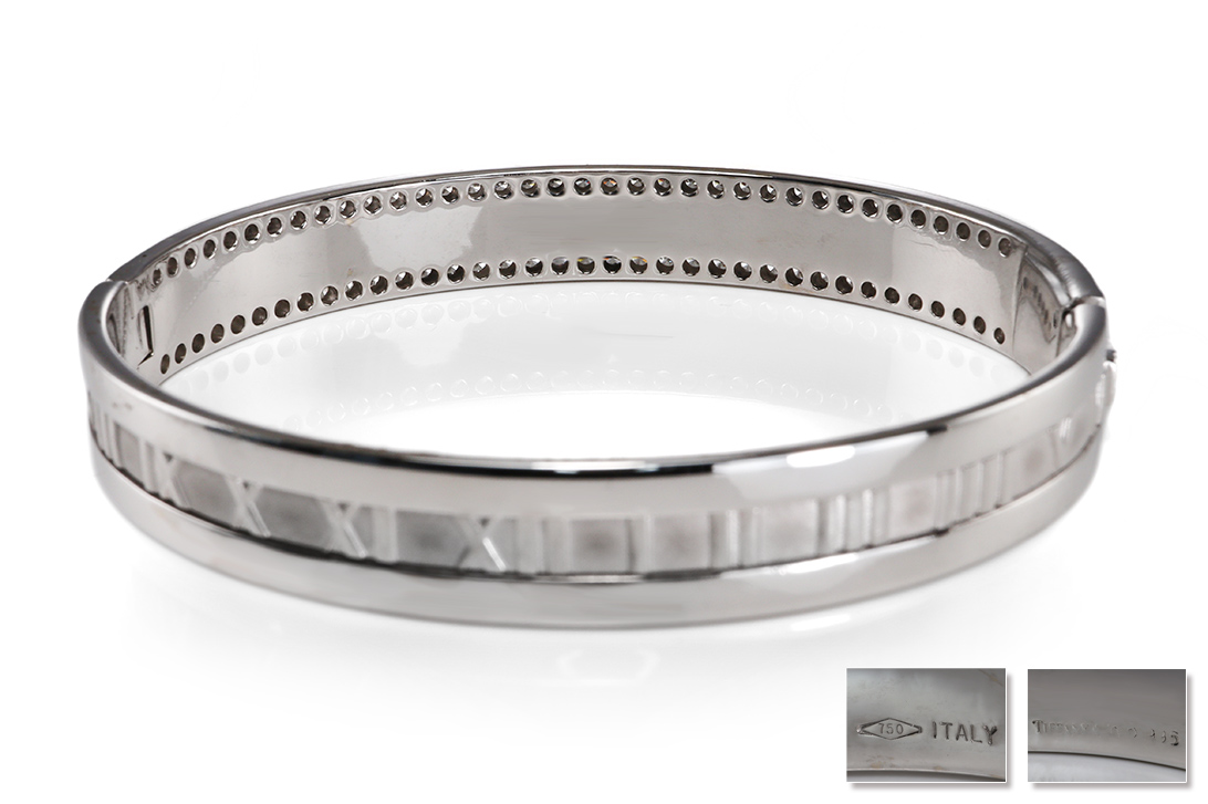 Die Oberfläche des Armbandes ist vollständig mit 84 fein gefassten Diamanten im klassischen Brillantschliff besetzt. Mit einem Gesamtgewicht von ca. 2,4 Karat entfalten die Steine ein außergewöhnlich lebendiges Funkeln. Die ausgewählte Qualität der Diamanten – in der Farbe River und der Reinheit VVS – unterstreicht den hohen Anspruch an Exzellenz, für den Tiffany & Co weltweit bekannt ist. Das Zusammenspiel aus strahlendem Weißgold und brillantem Diamantbesatz sorgt für eine luxuriöse Ausstrahlung, die sowohl im Alltag als auch zu besonderen Anlässen überzeugt.
