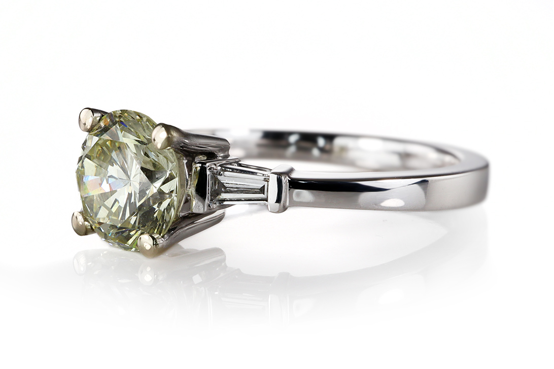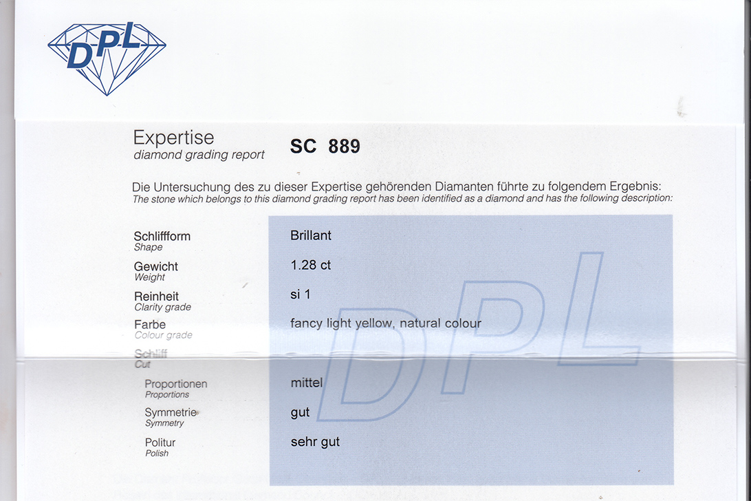 Dieser Ring hat eine klar strukturierte, elegante Form, die das außergewöhnliche Farbspiel seines zentralen Edelsteins eindrucksvoll hervorhebt. Gefertigt aus edlem 750/- Weißgold, strahlt das Schmuckstück eine moderne Raffinesse aus, die durch die ausgewogene Linienführung und die harmonischen Proportionen noch verstärkt wird. Im Mittelpunkt steht ein Diamant von beeindruckenden 1,28 Karat, dessen natürliche Farbe in Fancy Light Yellow dem Ring eine unverwechselbare, luxuriöse Ausstrahlung verleiht. Sein präziser Brillantschliff sorgt für ein lebendiges Funkeln, das bei jeder Bewegung faszinierend aufleuchtet.