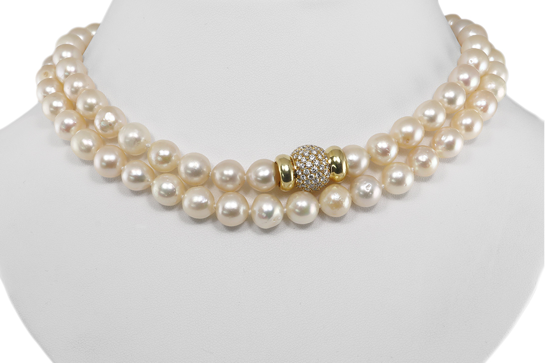 Die Kette besteht aus 81 Akoyaperlen mit einem Durchmesser von ca. 9,3 bis 9,9 mm. Ihre cremefarbene Nuance wirkt warm und edel, während die leicht unregelmäßige Form und vorhandene Wachstumsmerkmale den natürlichen Charakter der Perlen unterstreichen. Durch ihre Größe und das gleichmäßige Erscheinungsbild entsteht ein besonders hochwertiger Gesamteindruck.
