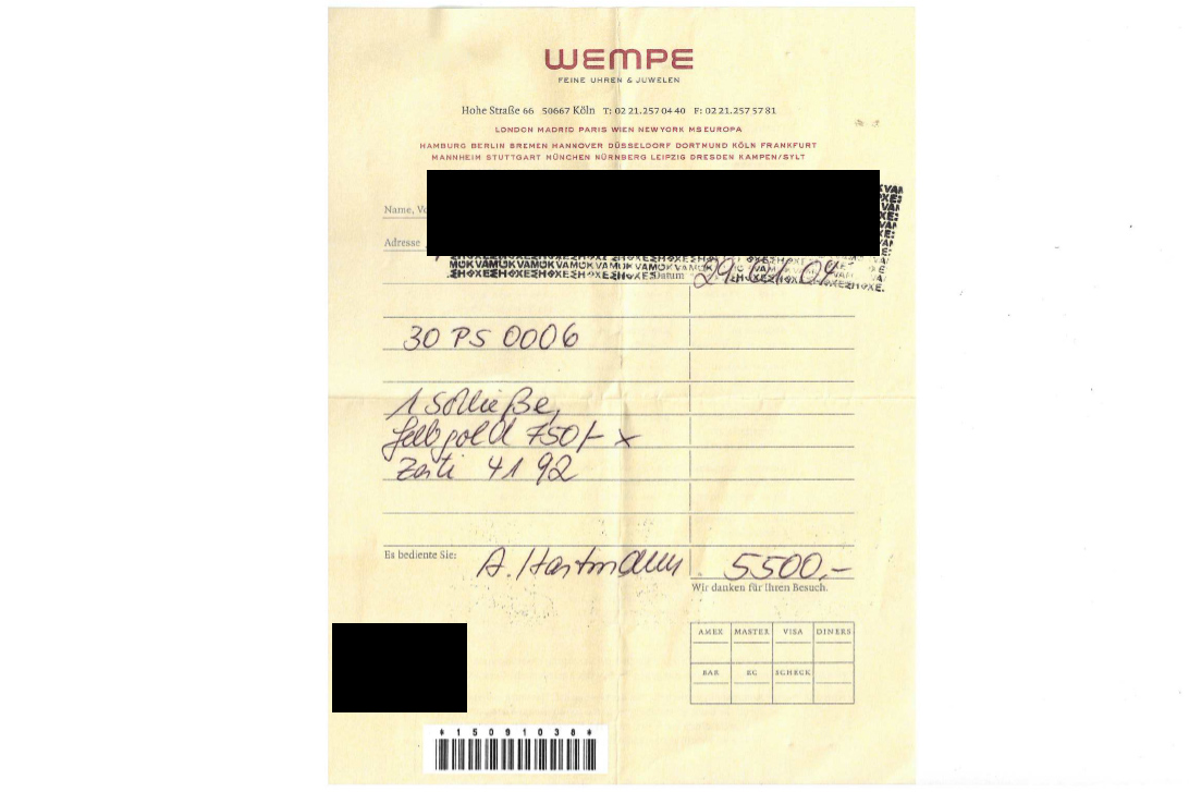 Ein herausragendes Detail ist das aufwendig gearbeitete Steckschloss aus 750er Gelbgold, gefertigt von Wempe. Dieses ist mit 108 Diamanten im Brillantschliff besetzt, die zusammen ein Gesamtgewicht von ca. 2,4 ct. aufweisen. In der Farbqualität Top Wesselton und mit lupenreiner Reinheit entfalten die Diamanten ein außergewöhnlich intensives Funkeln und setzen einen luxuriösen Akzent.